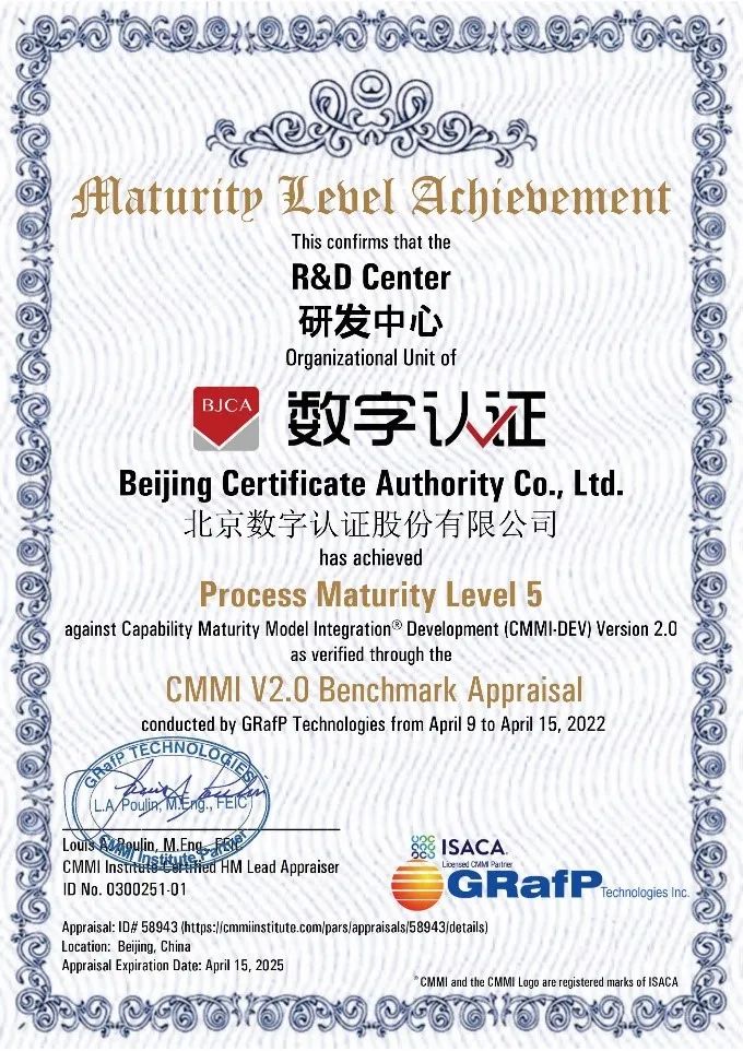 日前,北京数字认证股份有限公司顺利通过全球软件领域难度最大、规格最高的软件开发能力成熟度认证CMMI 5评估,并获得权威机构颁发的CMMI 5级证书。数字认证通过该评估,即标志着司的软件开发成熟度、质量管理水平都已达到国际先进水平,在软件开发管理标准过程体系、过程改进实施情况、项目管理能力等方面均已获得最高的国际权威认可。
