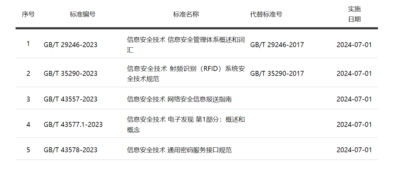 近日,国家市场监督管理总局、国家标准化管理委员会发布的中华人民共和国国家标准公告(2023年第20号),全国信息安全标准化技术委员会归口的5项网络安全国家标准正式发布,将于2024年7月1日正式实施。