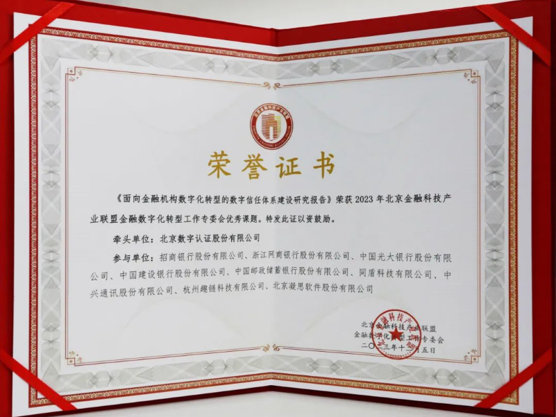 近日,由北京金融科技产业联盟主办的“金融数字化转型研讨会”在山东济南召开。会议同期,联盟对金融数字化转型工作专委会2023年优秀课题进行了表彰。其中,北京数字认证股份有限公司(简称:数字认证)牵头,联合招商银行、网商银行、光大银行、建设银行、邮储银行等参编单位,共同完成的《面向金融机构数字化转型的数字信任体系建设研究报告》被评为优秀课题。
