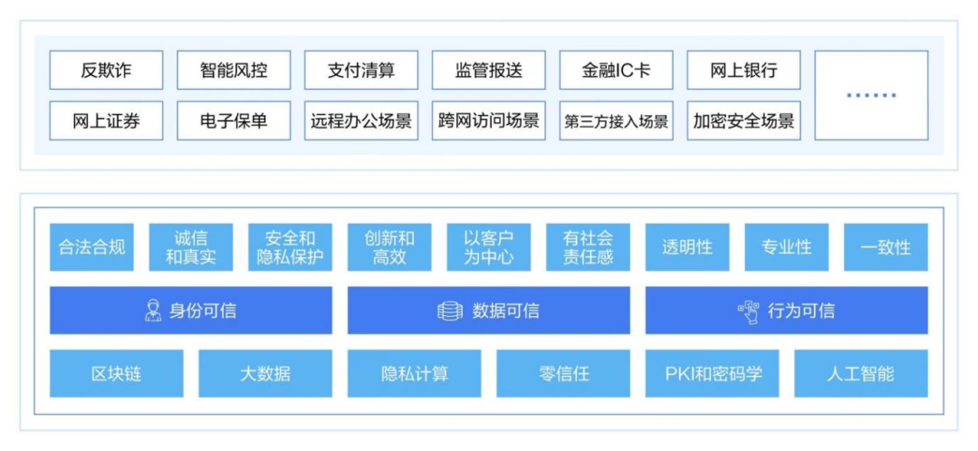 《面向金融机构数字化转型的数字信任体系建设研究报告》,是以金融科技新四年规划为根本遵循,在“高质量推进金融数字化转型”“深化数字技术金融应用”的背景下于金科联盟内立项的。该课题聚焦数字经济时代下的数字信任,为如何创新应用密码、人工智能、隐私计算、零信任、区块链、可信计算等关键技术,构建以身份可信、数据可信、行为可信为核心的金融数字信任体系,提供了基本思路。其研究成果对于赋能数字银行、网上证券、电子保单等业务安全、合规、可信、高效开展,向外传递可信特征,传递企业信任之力,具有重要参考价值。