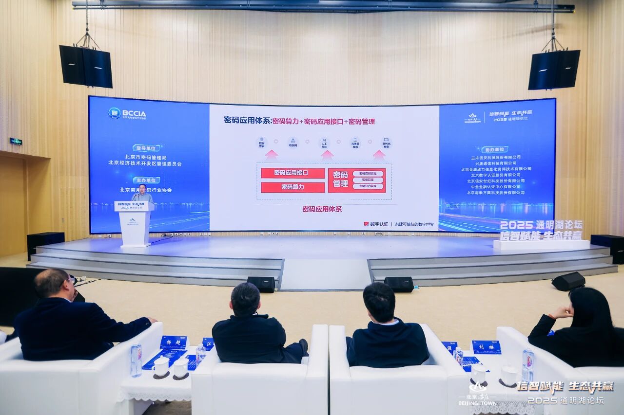 10月30日,由北京市密码管理局指导,北京商用密码行业协会主办的“密码赋能 信智未来”商用密码论坛在北京成功举办。论坛邀请了国家密码管理局商密办、工业和信息化部信息技术发展司、北京和天津市密码管理局、北京各区密码管理局,以及市发改委、网信办、经信局、政数局、财政局、公安局、卫健委、交通委、国资委等单位相关领导出席。同时,北京商用密码行业协会成员单位及行业优秀企业代表等应邀参加,政产学研用各方齐聚一堂,共商“密码+信息创新”融合发展大计。北京数字认证股份有限公司董事长詹榜华受邀出席,并发表《密码内生:开创国密应用新范式》主题演讲。
