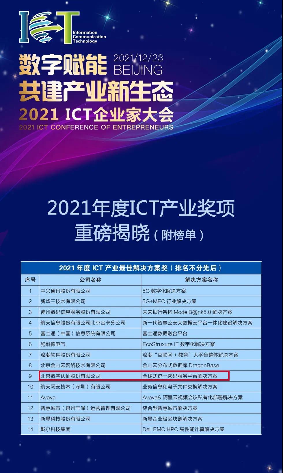 2021 ICT企业家大会 | 数字认证喜获年度最佳解决方案奖