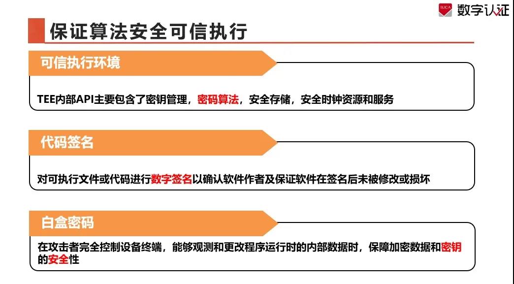 关于算法安全,通常是指“算法按设计预期平稳持续运行”。在实际应用中,算法执行过程面临着伪造输入、干扰执行、伪造输出等威胁,因此密码技术重点保障输入有效、执行正确、输出可靠。“例如TEE内部API就包含了密钥管理、密码算法、安全存储、安全时钟资源和服务,这就打造了一个可信的执行环境。”