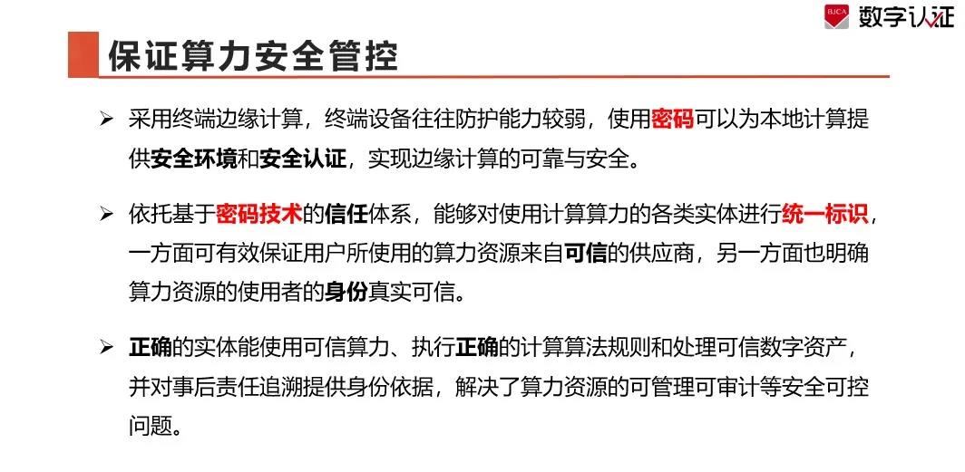 关于算力安全,他认为算力是数字经济发展的第一推动力,随着数据量越来越大,算法越来越复杂,需要非常非常高的算力支撑,无安全管控下的算力可能成为不法分子手中的攻击性武器。而密码技术能够确保算力被正确的实体、以正确的方式使用,并对结果负责。“依托基于密码技术的信任体系,能够对使用计算算力的各类实体进行统一标识,一方面可有效保证用户所使用的算力资源来自可信的供应商,另一方面也明确算力资源的使用者的身份真实可信。”他举例道。